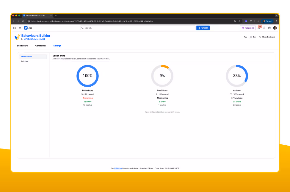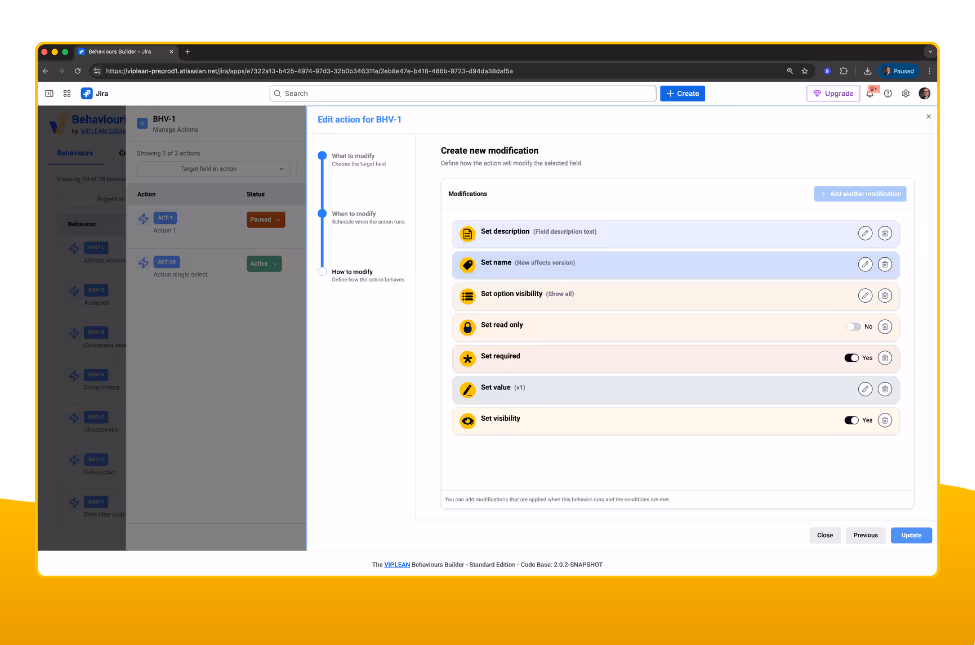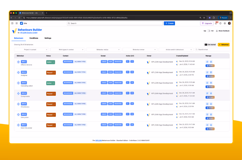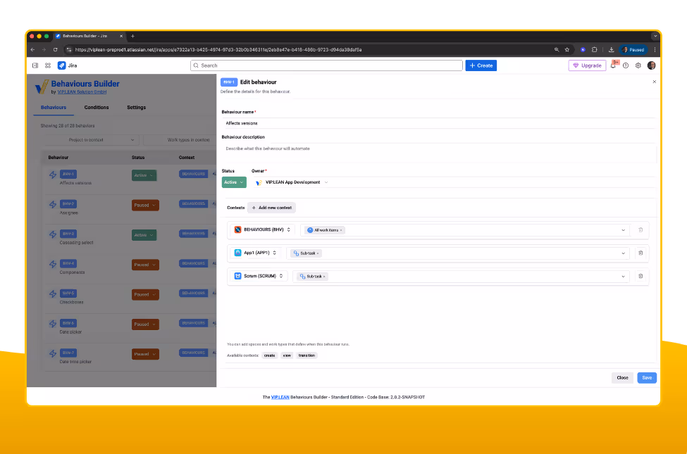 The app checks what’s supported in your current Jira context while you configure. You only see valid options—so behaviours work reliably from day one.