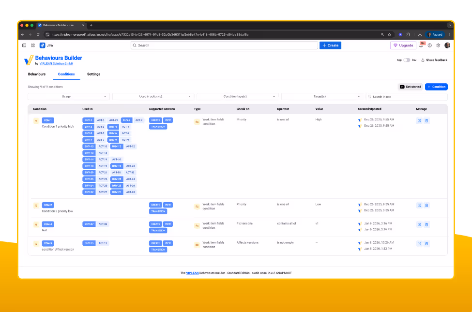 Define behaviours that apply across spaces, work types, and screens, add flexible conditions based on context and user input, and choose how Jira screens should adapt — from showing or hiding fields to setting requirements, labels, descriptions, and values. All configurations are continuously validated against your Jira context, ensuring only eligible rules can be published. Once saved, changes are applied instantly, turning static Jira screens into clear, context-aware user interfaces.